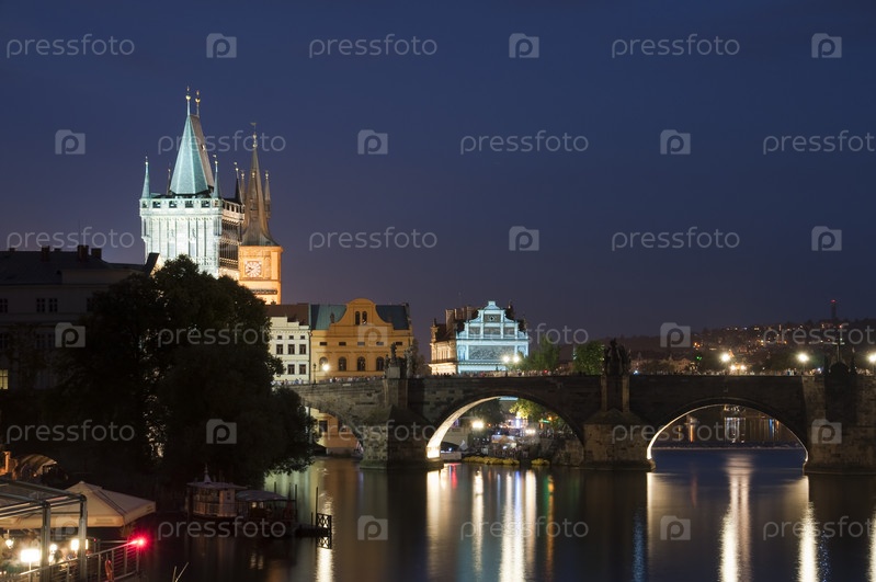 Ночной вид на набережную реки Влтава и Карлов мост в Праге