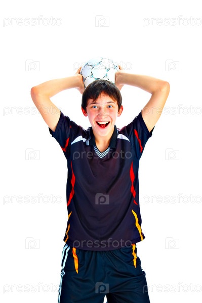 Футболист с мячом на белом фоне
