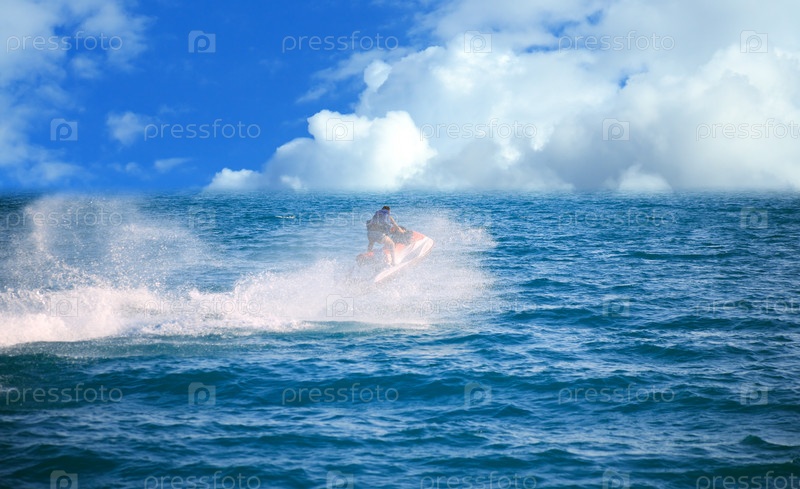 Красный гидроцикл, движущийся с высокой скоростью на море
