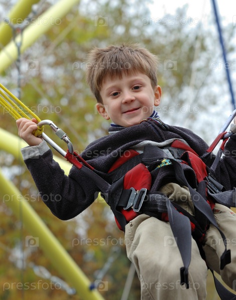 Мальчик прыгает в парке на аттракционе