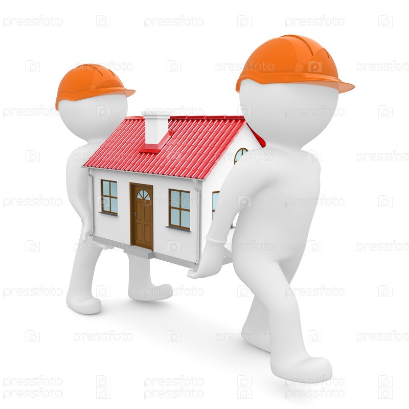 Два рабочих несут дом с красной крышей на белом фоне