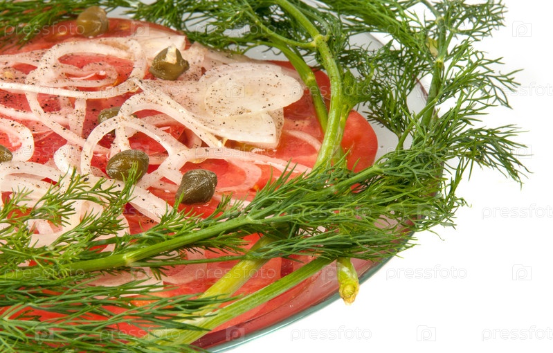 Нарезанные помидоры и лук на блюдце на белом фоне