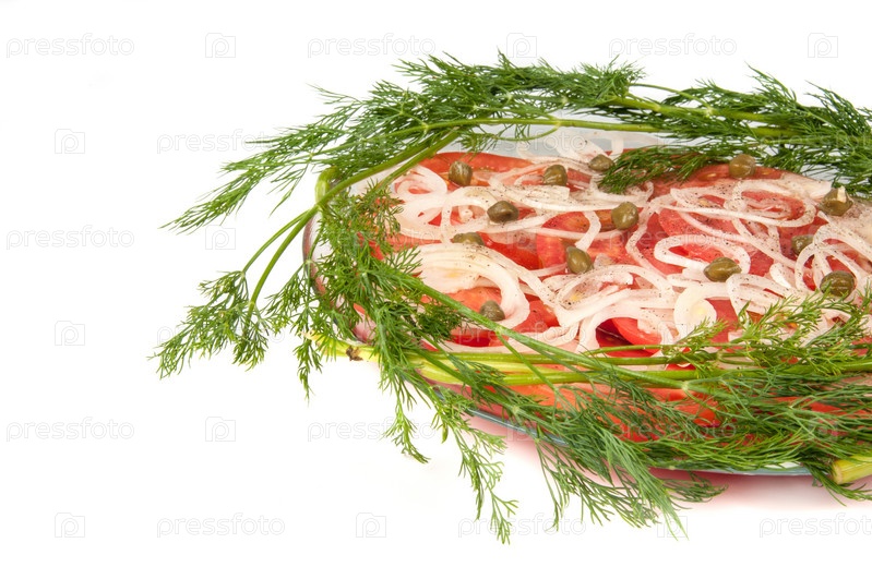 Нарезанные помидоры и лук на блюдце на белом фоне