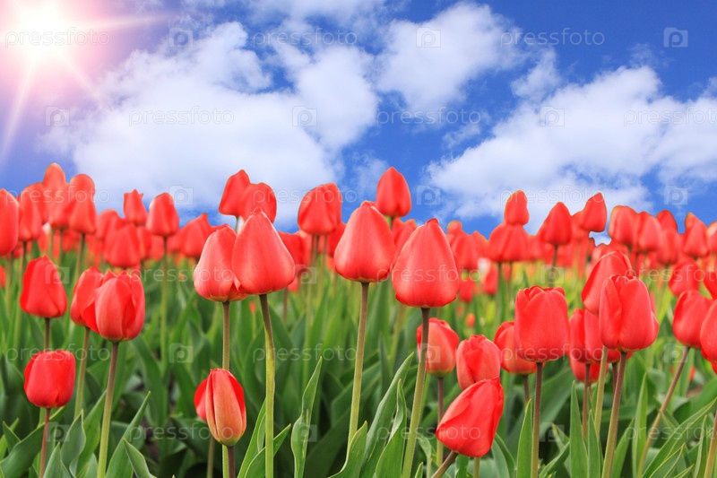 Красные тюльпаны под голубым небом