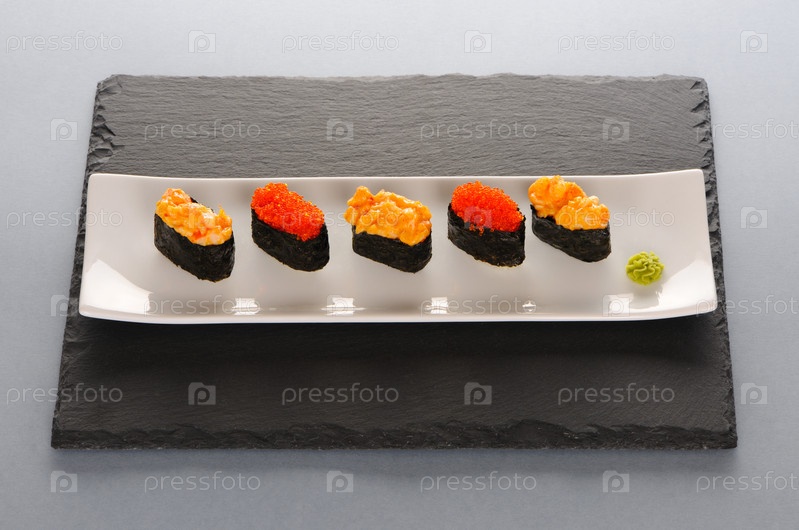 Суши с тобико и специями на тарелке