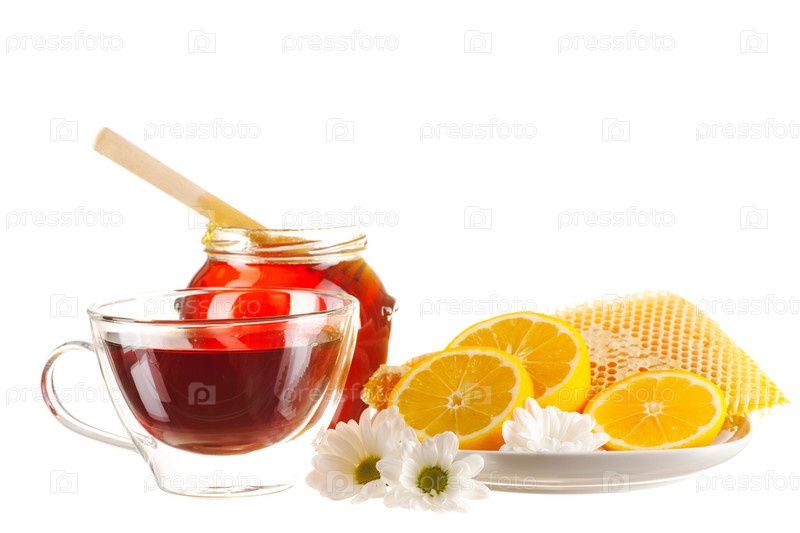 Банка меда и чашка чая на белом фоне