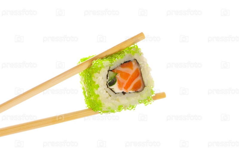 Суши ролл с палочками на белом фоне