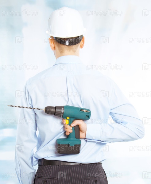 Отвернувшийся молодой человек в белой строительной каске с дрелью (шуруповертом)