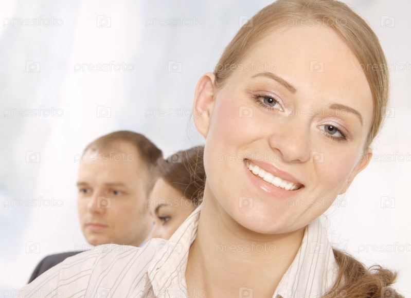 Улыбающаяся деловая женщина в офисе на фоне коллег