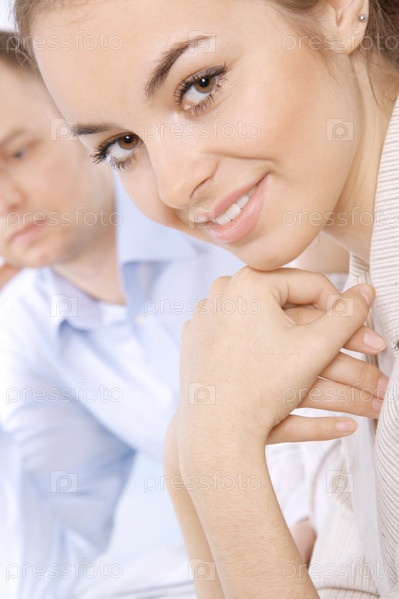Улыбающаяся деловая женщина в офисе на фоне коллег