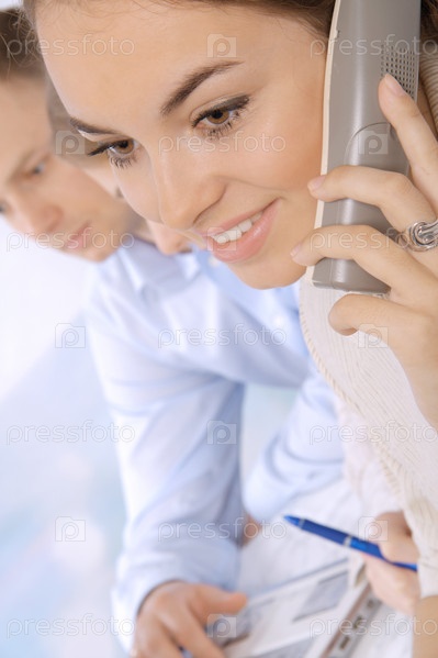 Молодая успешная бизнес-леди разговаривает по телефону в офисе