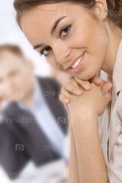 Улыбающаяся деловая женщина в офисе на фоне коллег
