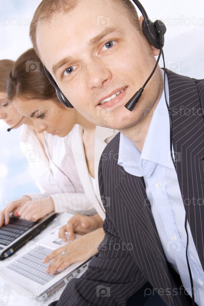 Сотрудники службы поддержки отвечают на звонки клиентов, в фокусе - молодой успешный мужчина - сотрудник офиса