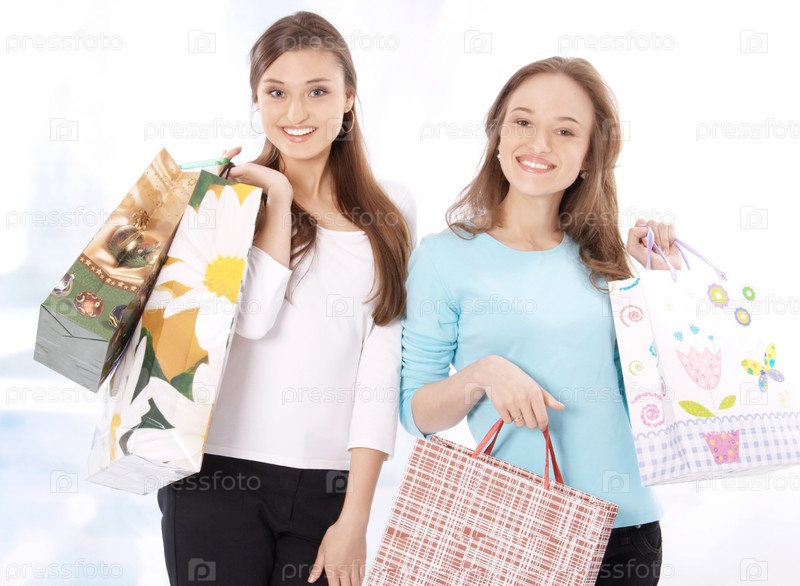 Портрет двух счастливых молодых женщин с покупками