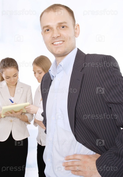 Молодой успешный бизнесмен в офисе, на фоне своих коллег-сотрудников