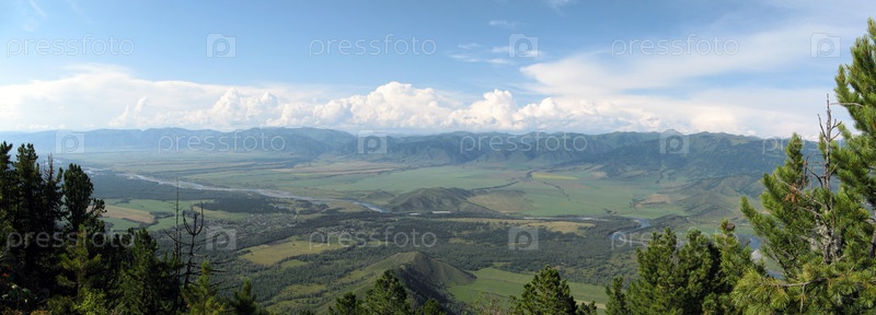 Панорама Уймонской долины. Вид с горы Филаретка на село Мульта. Горный Алтай