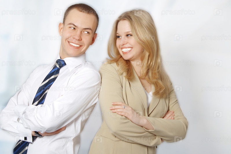 Портрет двух улыбающихся молодых людей в офисе на светлом фоне