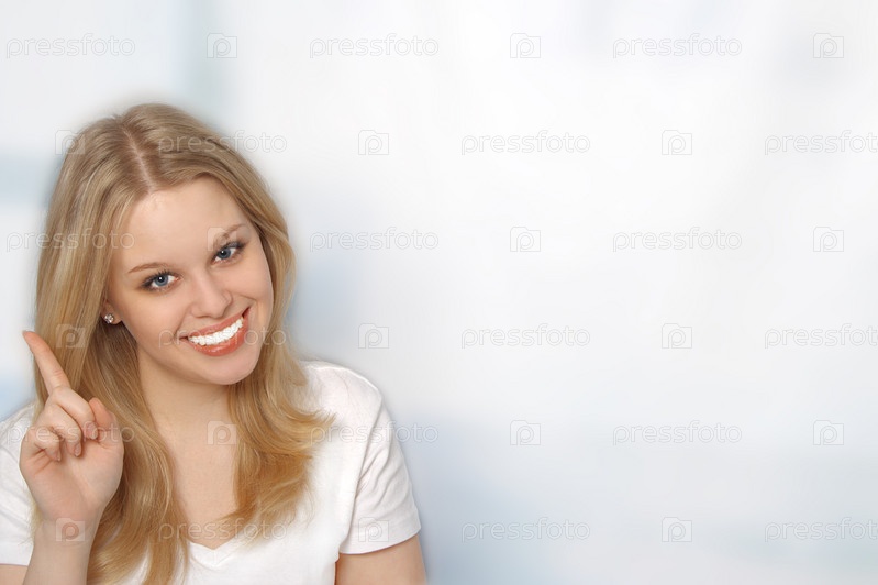 Портрет улыбающейся белокурой девушки на светлом фоне