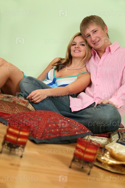 Влюбленная пара сидит на подушках