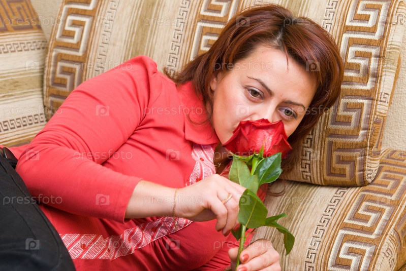Женщина с розой лежит на диване