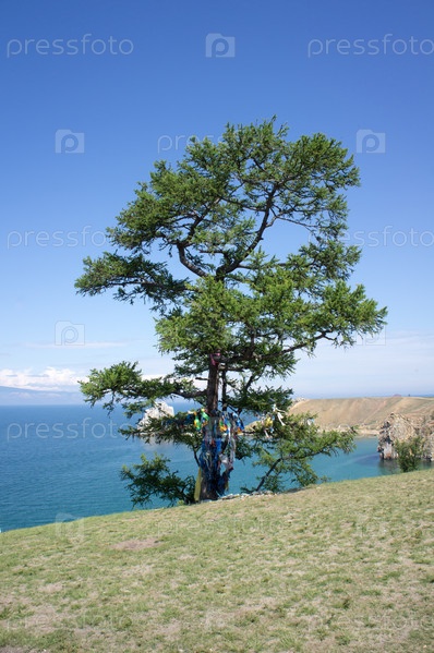Одинокое дерево на фоне мыса Бурхан на Байкале