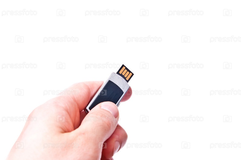 Флэш-накопитель в руке на белом фоне