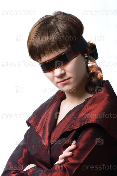 Серьезная женщина с пленкой на глазах, изолированная на белом