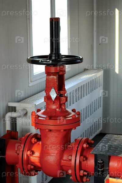 Красная металлическая задвижка с ручным управлением на пожарном водопроводе