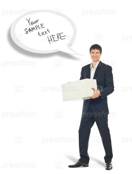 Курьер с посылкой на белом фоне