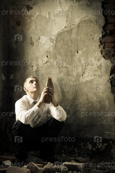 Печальный молодой бизнесмен сидит и держит старый кирпич
