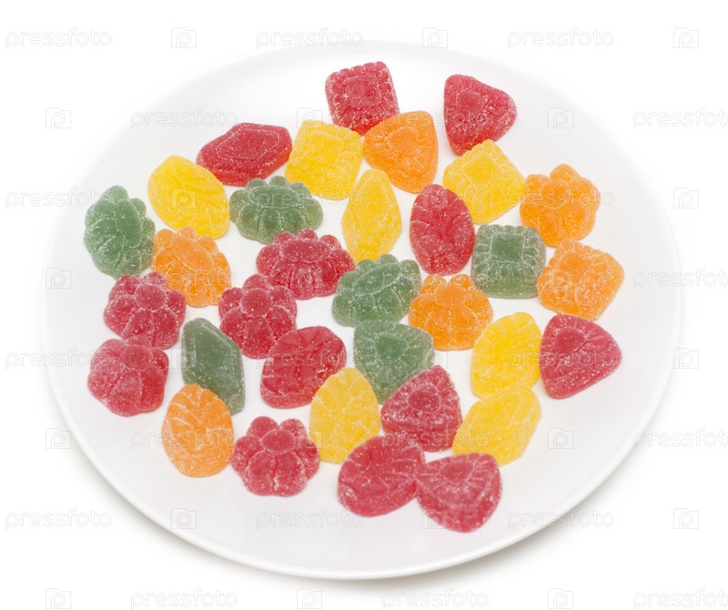 Фруктовые желейные конфеты на тарелке на белом фоне