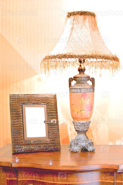 Настольная лампа и рамка на деревянном столе