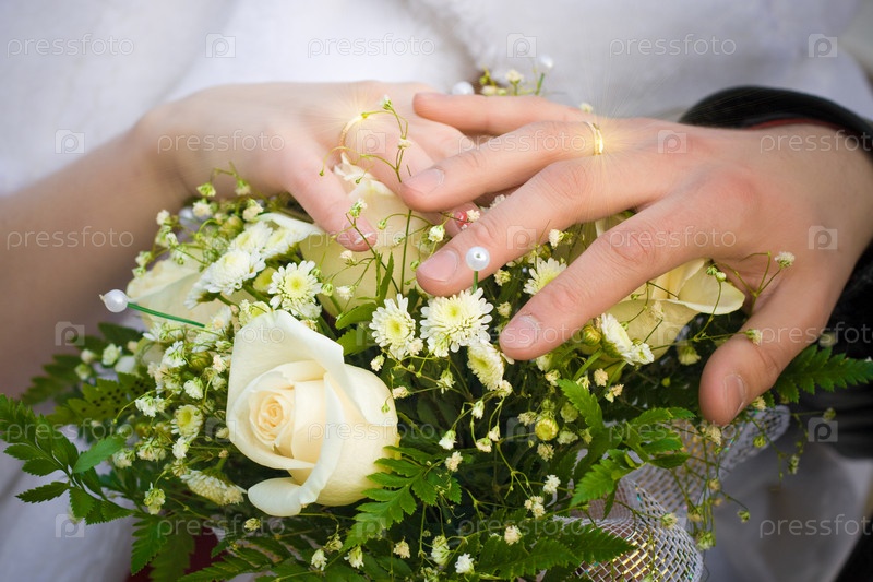 Свадебный букет и руки молодоженов с кольцами