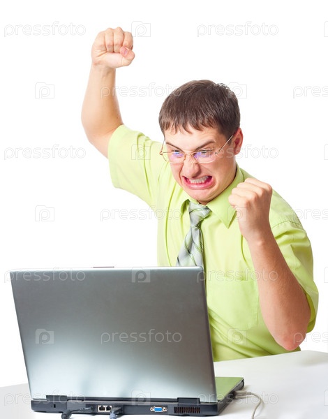 Злой бизнесмен с ноутбуком пытается ударить по экрану