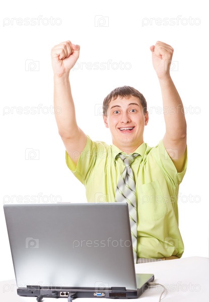 Счастливый бизнесмен с ноутбуком поднимает руки вверх