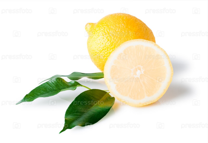 Желтый лимон с зелеными листьями, белый фон