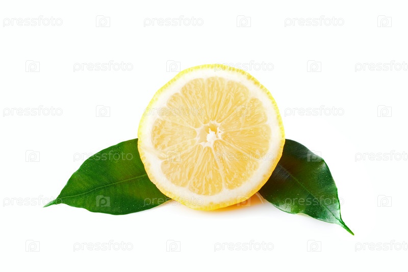 Ломтик лимона с двумя листьями, белый фон