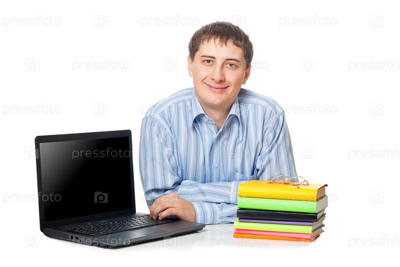 Мужчина с книгами и ноутбуком, изолирован на белом фоне