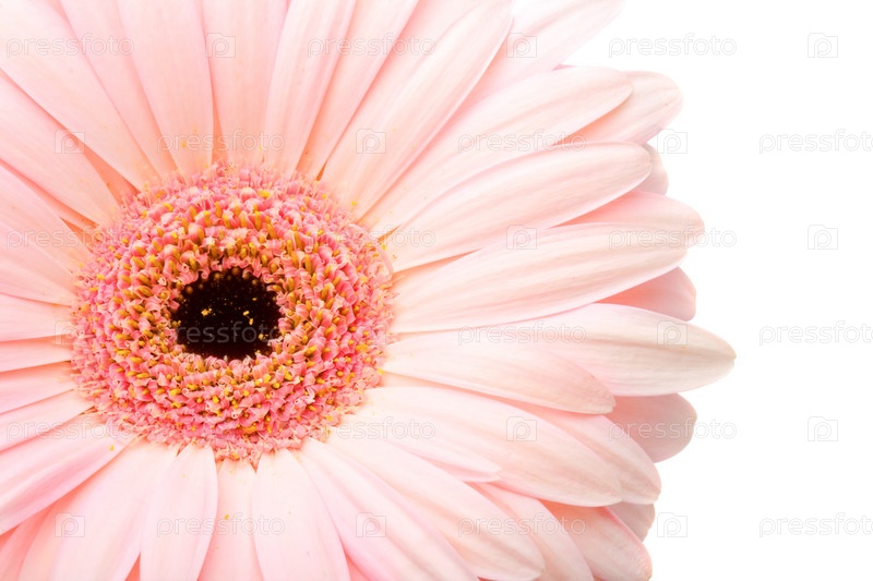Розовая гербера крупным планом на белом фоне