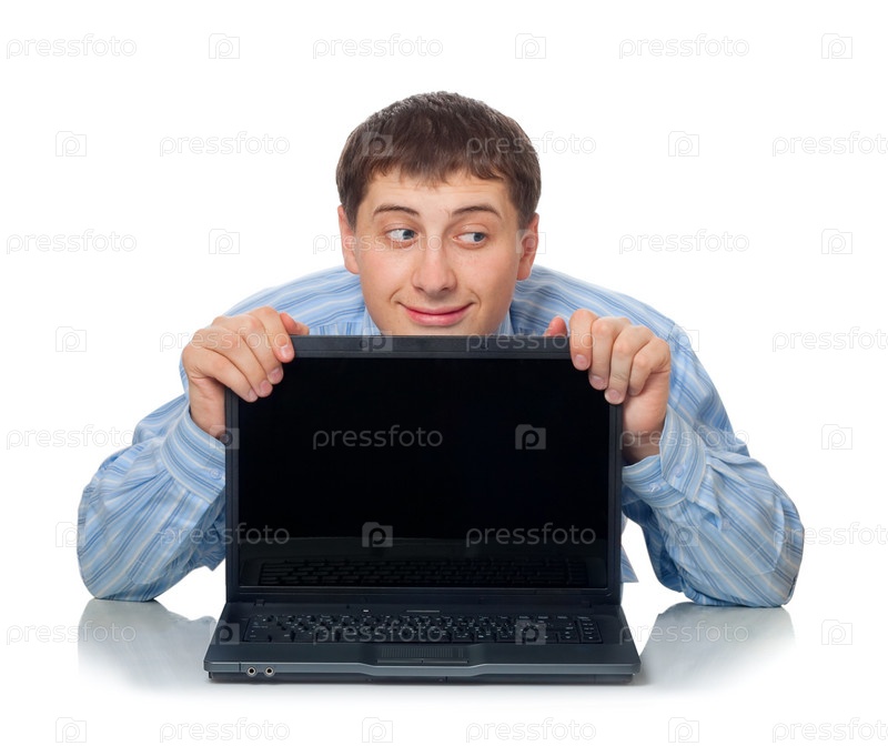 Хитрый мужчина с ноутбуком, изолирован на белом фоне