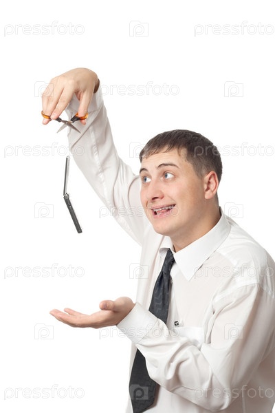 Бизнесмен отрезает невидимую нить, изолирован на белом фоне
