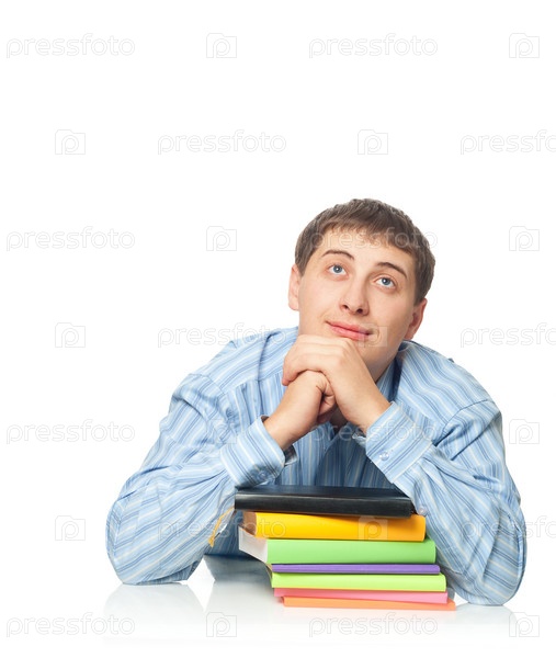 Портрет мечтательного молодого мужчины с книгами на белом фоне