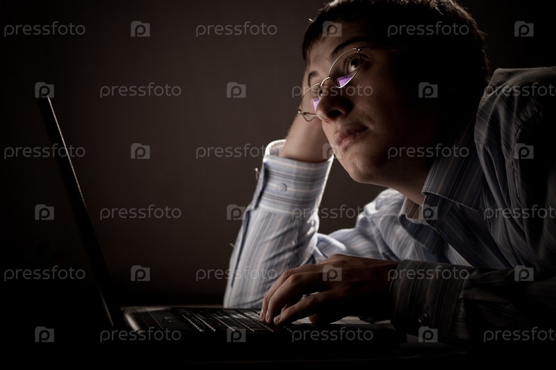 Молодой мужчина с ноутбуком в темное время суток