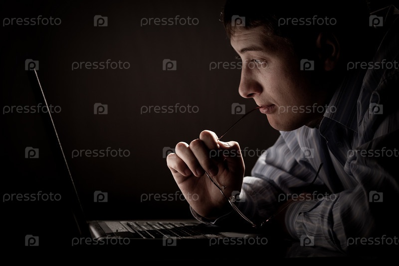 Молодой мужчина с ноутбуком в темное время суток