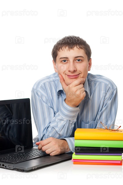 Портрет молодого человека с книгами и ноутбуком на белом фоне