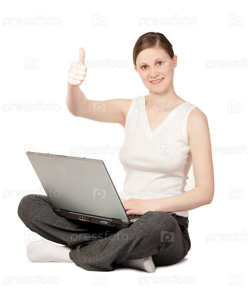 Портрет улыбающейся женщины с ноутбуком, сидящей на полу