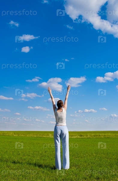 Женщина стоит на зеленом лугу с поднятыми к небу руками