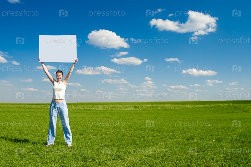 Женщина с пустым плакатом в руках стоит в поле на зеленой траве