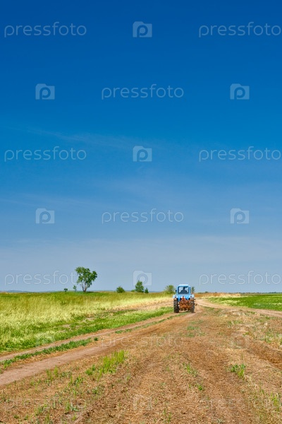 Трактор едет по дороге вдоль поля