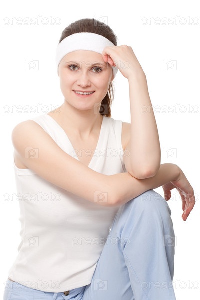 Портрет женщины в спортивной одежде на белом фоне